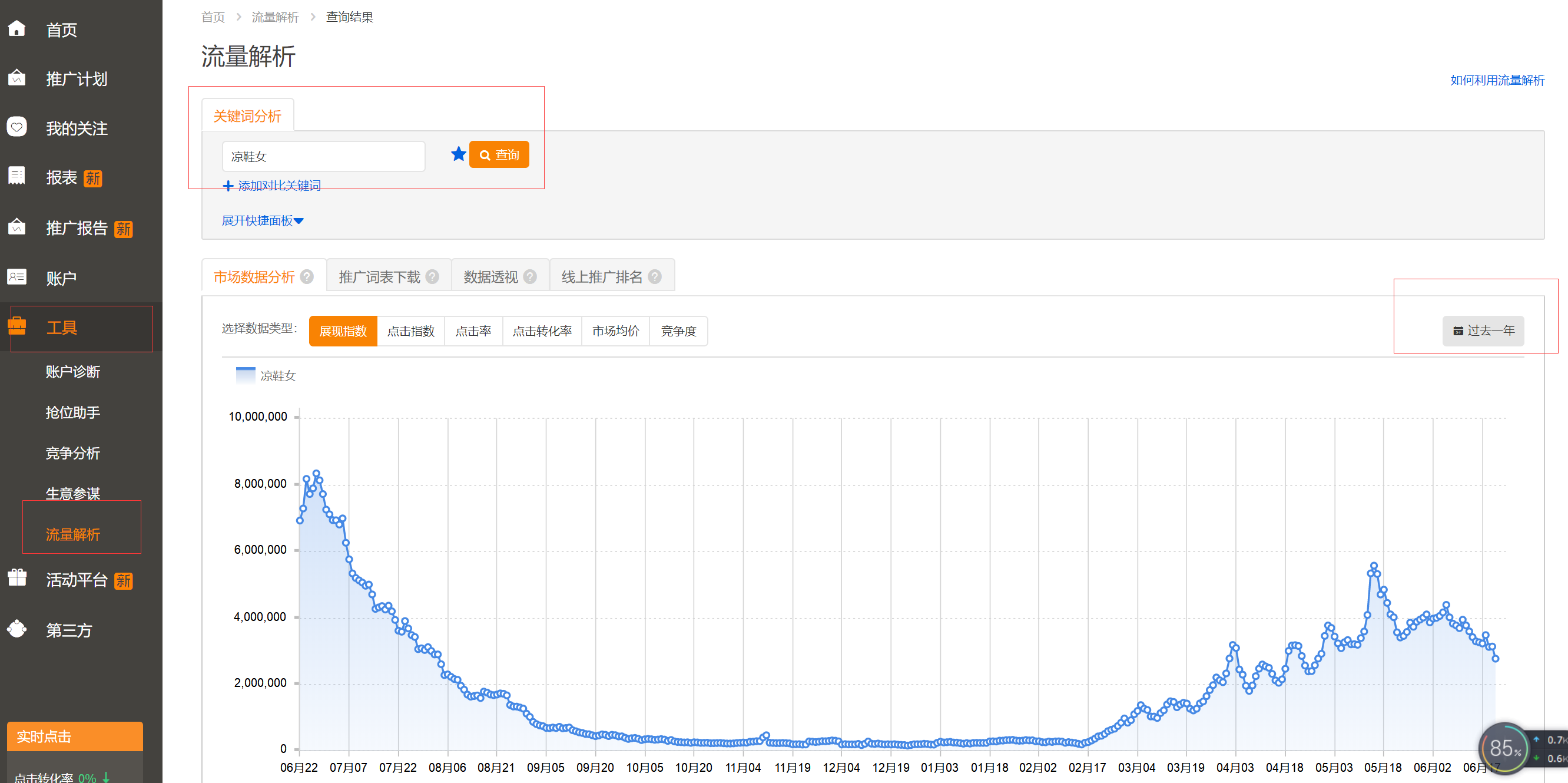 比如我搜“凉鞋女”,这是季节性的产品。通过这张图能看出来,从8月份-2月份这个时间段,绝大部分人是不会买凉鞋的。