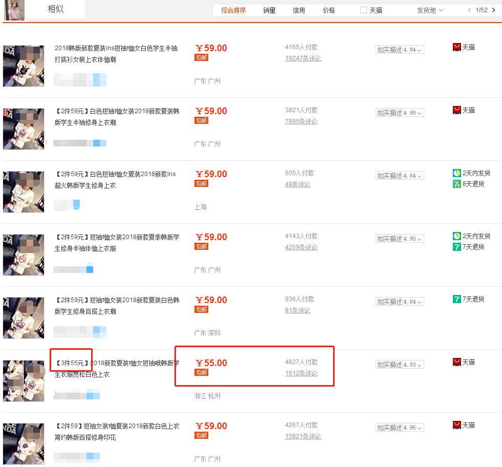 比如淘宝随便搜了一个同款,其他家还在2件59的时候,这家已经开始3件55了!