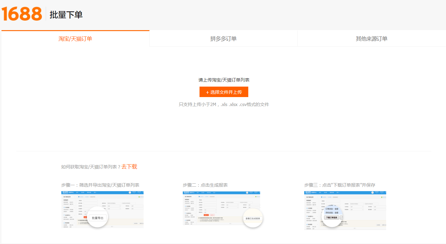 第二步:选择订单的数据来源,通过Excel导入的方式将下游淘宝、拼多多和其他渠道的订单导入到1688完成批量下单