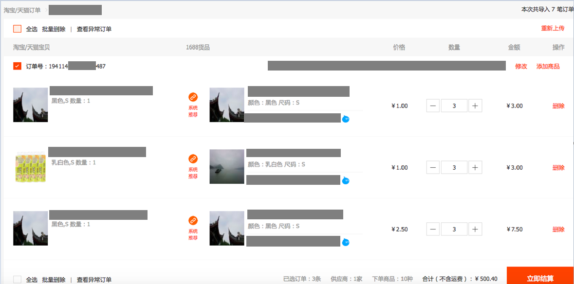 如您首次使用批量导入该商品或曾导入的下游商品信息发生变化,系统会出现无法自动识别的情况,此时,您需手动选择下游商品对应要购买的1688商品。同时如下图所示会提示匹配失败,或者商品匹配成功SKU需要您手工选择。