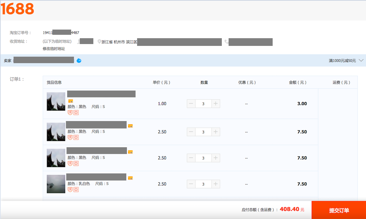 核对收件人、商品等订单信息,无误后可提交创建订单。