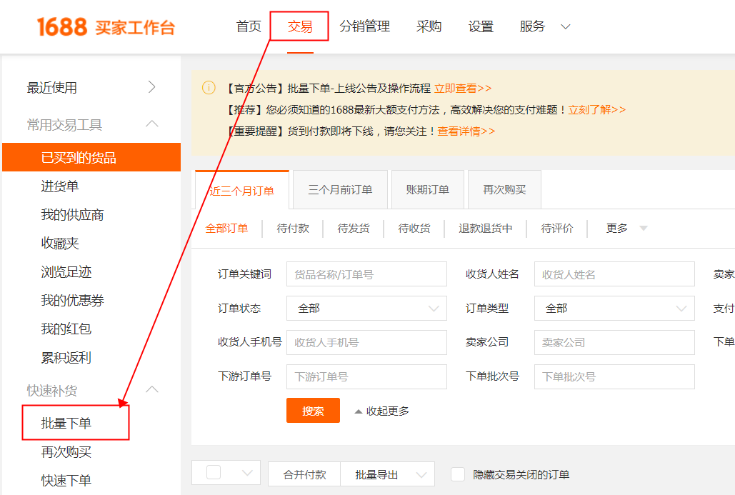 第一步:买家先进入“我的阿里”——选择“交易”——再选择“批量下单”即可进入操作页面<点此立即进入>