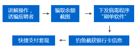 在这类型的骗局中,诈骗分子首先会要求应聘者提供银行卡余额截图,以便摸透应聘者的经济实力。那些余额较多的应聘者会被要求安装一个用于工作的软件,这个软件表面上是“刷单软件”,实际上是带有病毒的程序。待用户中毒后,诈骗分子再通过钓鱼的方式截获银行卡号、手机号、支付密码等信息,将应聘者的卡内钱财盗刷而走。