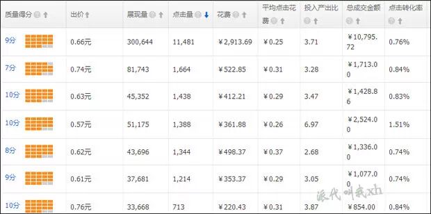 7. 前面的这个第一种方法主要是为了短期内拉起宝贝权重,如果无法把控每个环节,最好还是用以前的第二种方法:选几十个词相关性好起始分高的词,出价略高于系统给出的平均单价,不求排到前几页,只要能进前100名就行,然后每天根据投放的数据优化关键词,增删加减价,通过这种方式筛选出一批点击率和转化率都高过同行的词,经过一段较长时间的优化,质量得分会慢慢涨至9分10分,权重也稳步上升,最后就可以加词全面推广。