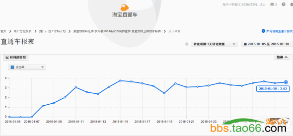 上图是我接手的一个客户的直通车数据,截了1月份的点击率数据,很显然,点击率是一路看涨,这是多少车手梦寐以求的结果,因为点击率上升了有很多好处,下面讲直通车点击率的意义。