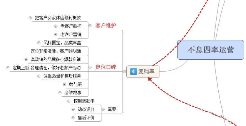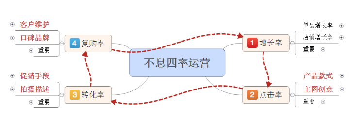 3.重点四率运营为:增长率、点击率、转化率、复购率。由点到线再到面后成体系!