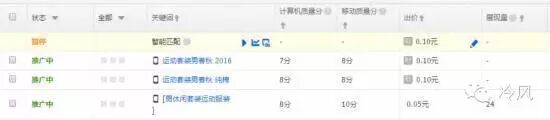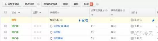 3.培养到10分之后我们就可以把这3个长尾词删除了。然后我们可以加我们需要推广的大词进去。建议大家不要一下子就加最大的词可以先加:运动套装男春秋、运动套装男开衫等3级词然后再加 运动套装男。然后就是运动套装、运动服等大词进去!