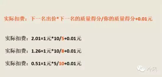 实际扣费=2.01=1元(出价)*10(下一名的质量得分)/5(你的质量得分)+0.01元