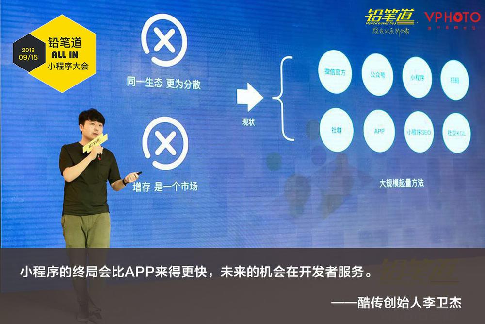 讲完微信小程序和APP的区别之后,酷传创始人李卫杰讲述了自己对微信生态的理解。中国人开发APP总量202万,小程序总量到今年六月份达到100万,至此,李卫杰乐观表示,“预计未来一年小程序总量会超过APP总量”。