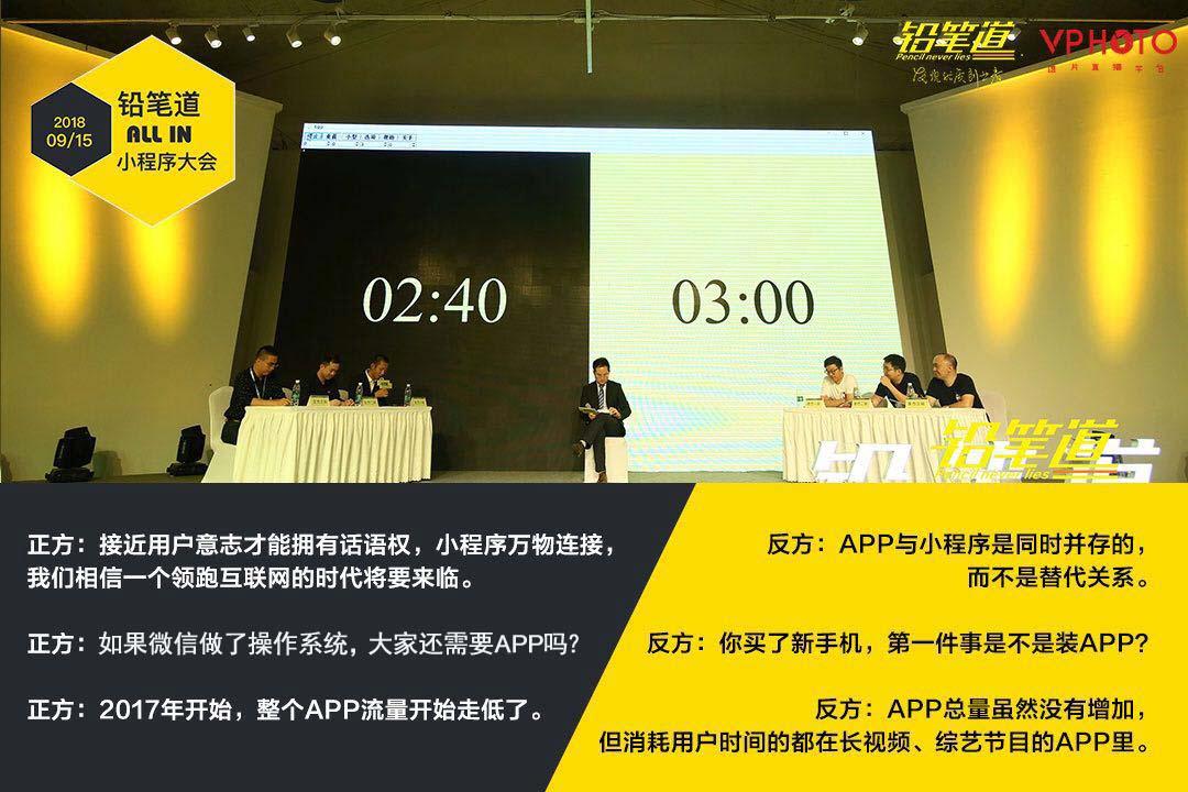 接下来为辩论环节,铅笔道“All in小程序”大会现场上演“奇葩说”,辩论主题为“微信小程序,APP的终极杀手”。