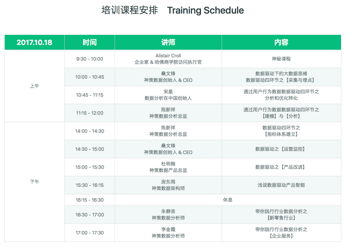 训练营于本次大会再度开课,依旧是一票难求。本次大会的强化版的训练营将为学员解疑释惑,适合认可精益数据分析的理念、想提升营销与运营转化率、想掌握用户体验改进与产品智能化实现最佳路径的学员。