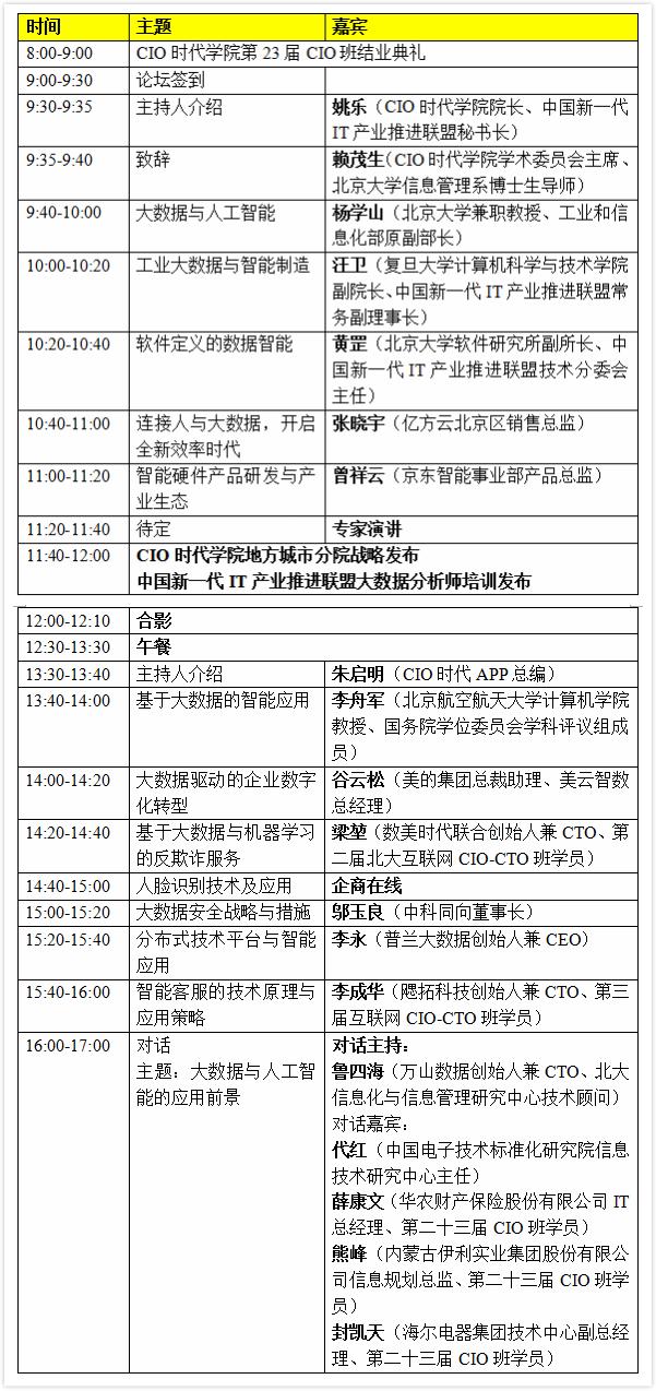 届时,北大CIO班学员、CIO时代学院学员、全国高校大数据教育联盟成员、其它大数据领域专家和管理者等将汇聚一堂,围绕“大数据与人工智能”展开主题分享与交流。共同探讨大数据与人工智能技术的发展趋势,以及由此引发的行业变革。为企业迎接人工智能时代的到来提供指导性意见,正视各行业所面临的机遇与挑战。