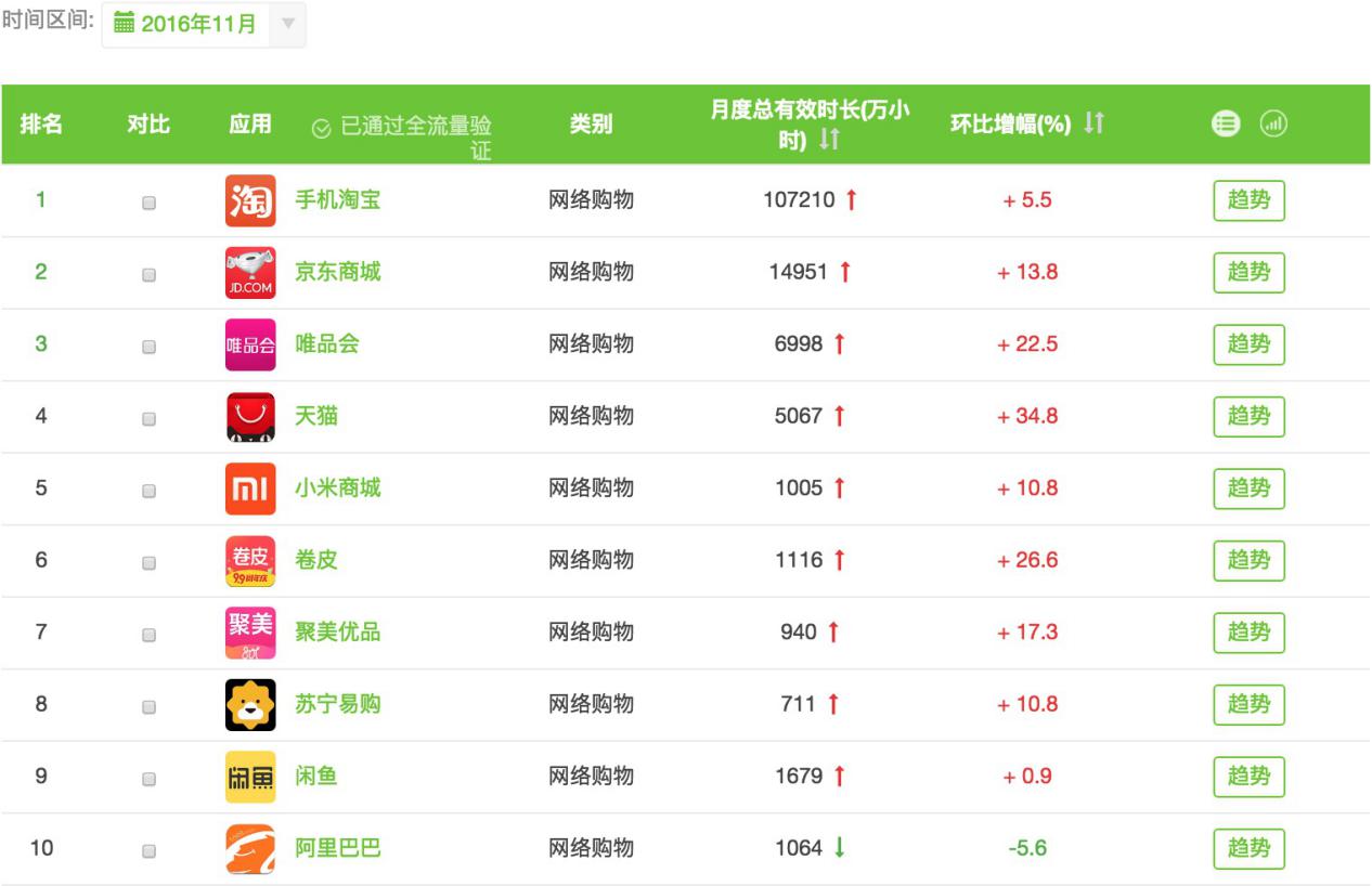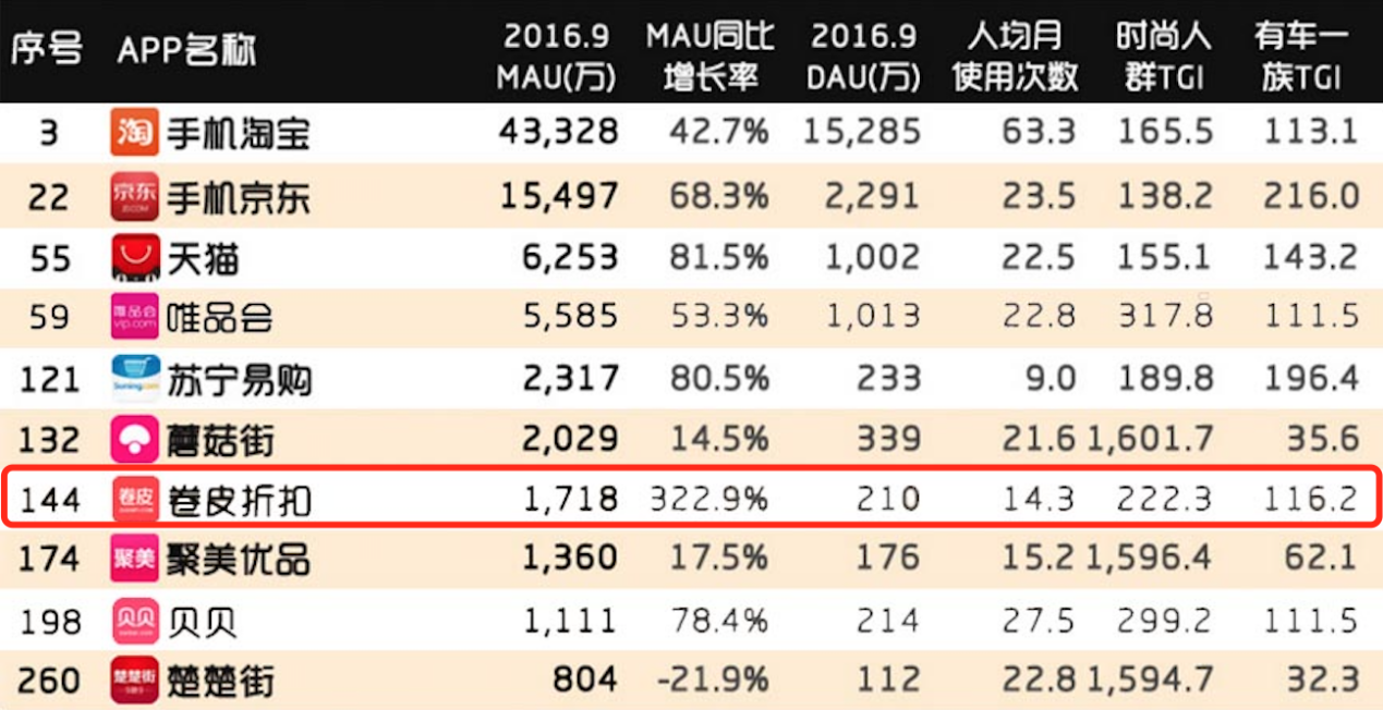 基于快速和稳定成长,卷皮从初创平台晋级电商版图重要玩家,多个第三方机构年底榜单中,卷皮稳定排名仅次于淘系、京东、唯品会和蘑菇街等。易观11月移动APP榜单,卷皮排名第7位,艾瑞11月份电商APP独立设备覆盖榜单中,卷皮排名第6位,在猎豹全球智库10月发布的《2016年中国电商App排名》,卷皮排名第6位。