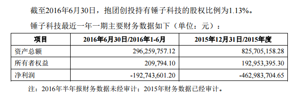 抱团创投曾于2015年6月参与投资锤子科技,投资额3000万元,参与占股1.13%。