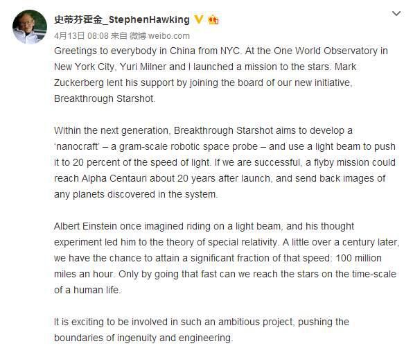 现在答案来了,霍金先生在中国发出的第一条微博有99个单词,假设不出错误,也需要30分钟左右,再加上,思考、排版等,大约需要40分钟,霍金先生才完成了他对中国粉丝的第一次问候。