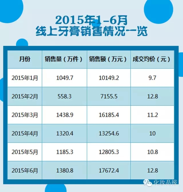 维恩数据显示,2015上半年,牙膏产品在线上共销售6933.4万件,销售额为77222.5万元,成交均价为11.1元。