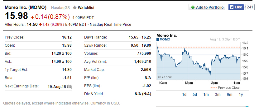 陌陌股价盘后下跌9.26%