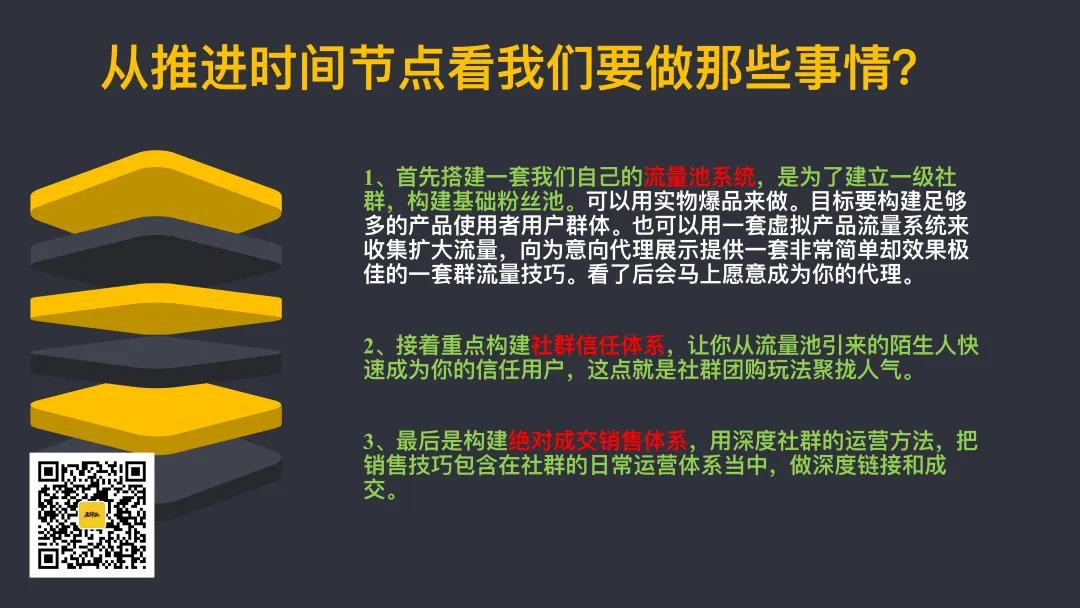 其实我们最终的目标就是要帮助群主、代理,因为你如果一个人,也运营不了多少群,一个公司运营百八十个群就已经很累很累了,所以一定要教会代理,让我们的代理学会去运营好他的所有群。我们要帮助群主塑造他自己独有的圈层,构成二级社群,由我们输出给他们的案例、素材以及管理方法,让他们去建好自己的社群,然后把利润的大头分给他,这些人才会死心塌地跟你干。
