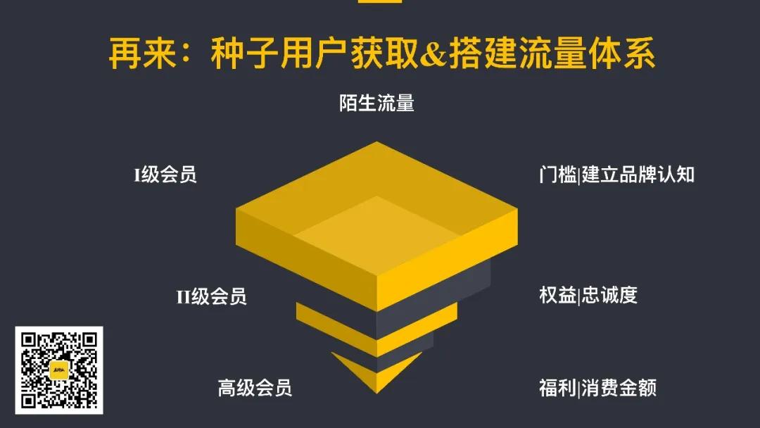 从最开始陌生的流量,把它装进来,从一级会员升级到二级会员,升级到高级会员。一定是要有一个门槛,让这个门槛去筛选泛流量,通过已经建立好的会员群的权益来检测这些流量对品牌的忠诚度,最终在群内去发放会员制的福利。通过衡量消费金额,逐步把优质的消费者变成为你的代理。最后,实现线上和线下的完整通路。