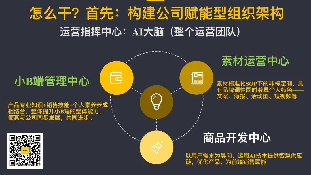 要有这种思维的转变,就一定要有一个赋能型的组织框架。我们要成立一个专业化运营私域流量的团队,它必须有这样的几个部门:一个专业化的素材运营中心,里面包含了专业做各种技能的工种,比如说有好的美工、有好的文案、有好的社群运营官、有好的社群活动官、有好的社群内容输出官等;另外还要有一个非常好的代理管理中心,因为一个人卖不如很多人帮你去卖。