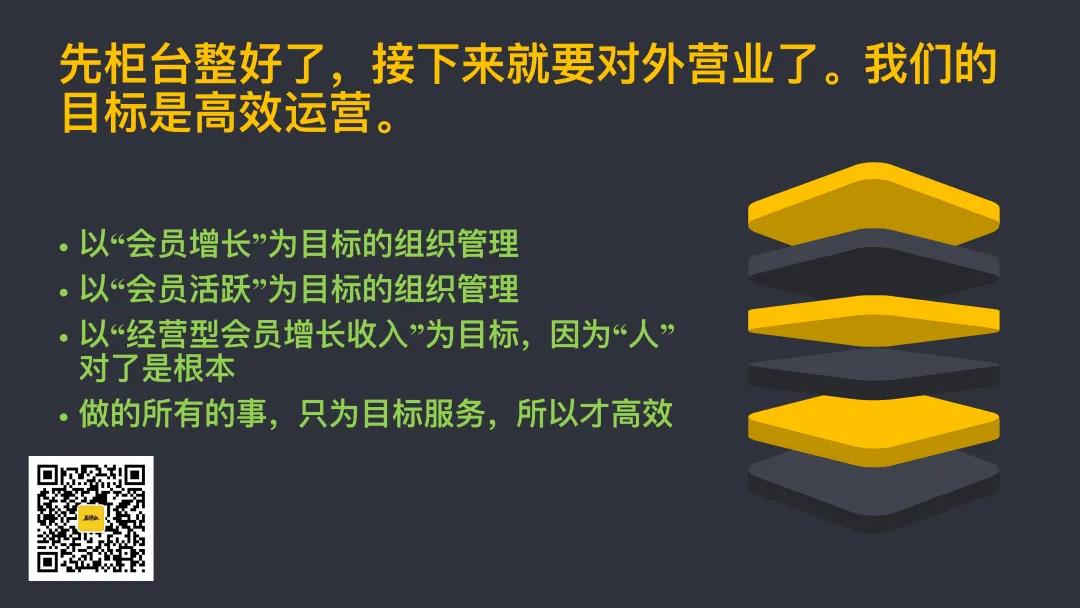 我们现在有很多人讲了很多所谓的社群课,天天都在讲怎么在社群里面搞促销、怎么能一口气裂变多少人、以后一口气能够卖多少东西……但是实际上,真正想让这个社群变得长久、变得持续有成交、持续有复购,一定是不光是卖东西。没有人因为要在这个群里面买东西而天天在这个群里面的,他们一定是要有一个精神的,觉得这个群有温度、有爱心、有温暖,能够大家一起集体地去谋取一种利益,这样的话,这个群才会变得活跃。所以,我们真正是通过会员制的方法,把一批同频的人,有理想、有追求或者是有一定赚钱欲望的人,把他们圈在这个社群当中。