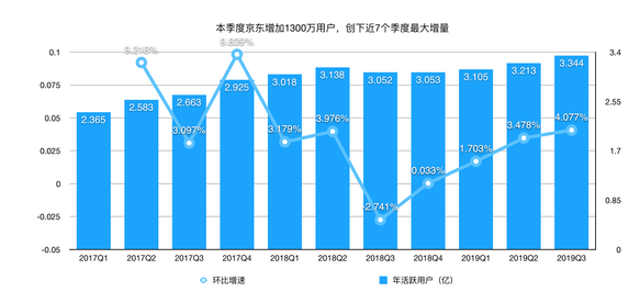 此后,连续三个季度,京东用户数量恢复增长。本季度,在截至今年9月30日的十二个月,京东年度活跃用户为3.344亿,相比上一季度的3.213亿,京东增加了1300万用户,创下近7个季度最大增量。京东称,第三季度,超过70%的新客户来自低线城市。