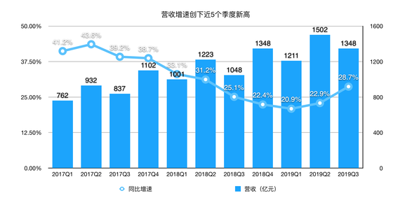京东营收在经历触底反弹后,恢复增长。本季度,京东营收同比增长28.7%,是继2018年Q3营收增速低于30%后最大一次涨幅,创下近5个季度新高。