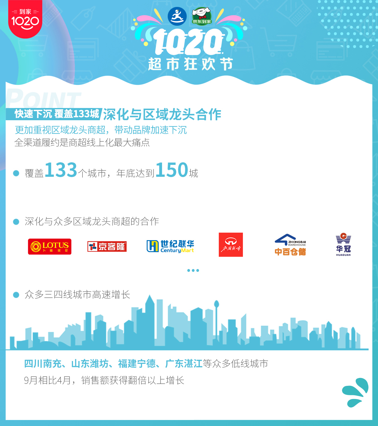 除了深化与全国连锁商超的合作,伴随下沉战略,京东到家更加重视区域龙头商超,帮助品牌商下沉到三四线城市。“百城万店”项目就是达达-京东到家联手区域商超和品牌商,发力下沉市场的重要营销策略。截至9月底,京东到家已覆盖133个城市,今年年底将达到150城。