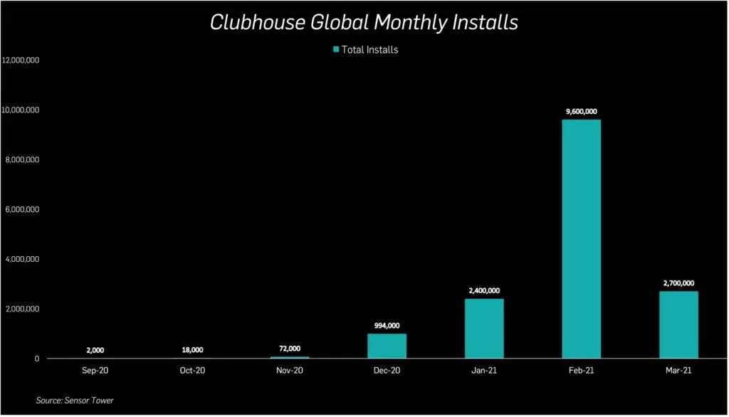 Clubhouse的每月下载量变化情况。数据来源:Sensor Tower