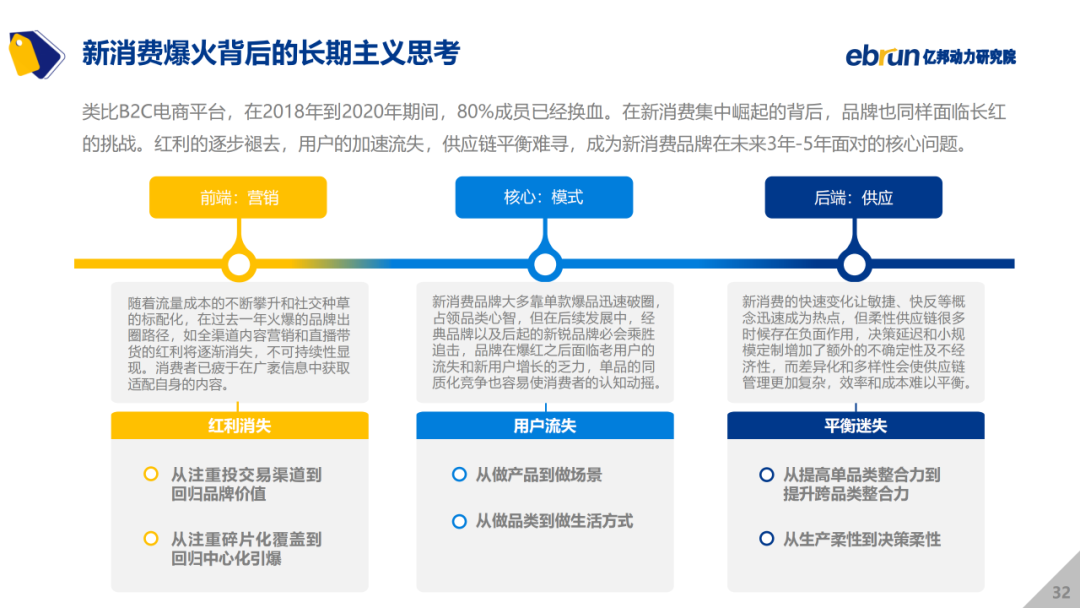 亿邦动力研究院发布《2021中国新消费品牌发展洞察报告》,以品牌视角切入,全面解读新消费生态中,品牌各不相同的创新打法和成长路径,以及品牌与用户、平台、服务商、供应链之间关系的升维和升级,并回归商业本质逻辑,从营销、供应链和品牌核心模式三方面,探讨新消费品牌爆红背后的长期主义思考与方向。