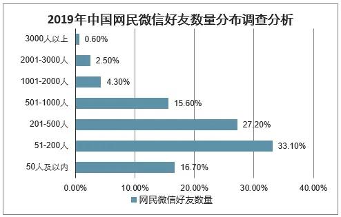 2020年年初,有调研报告分析2019年约33.1%的受访网民微信好友数量处于51至200人之间,27.2%的受访网民微信好友数量集中在201至500人。平均下来每个人有250左右个微信好友。
