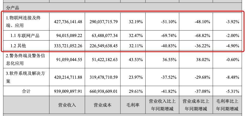 而在主营业务分析中的“分产品”方面不难看到,高新兴在物联网方面并未取得良好的发展——在物联网方面,高新兴营收为4.27亿元,相比去年降低51.1%。