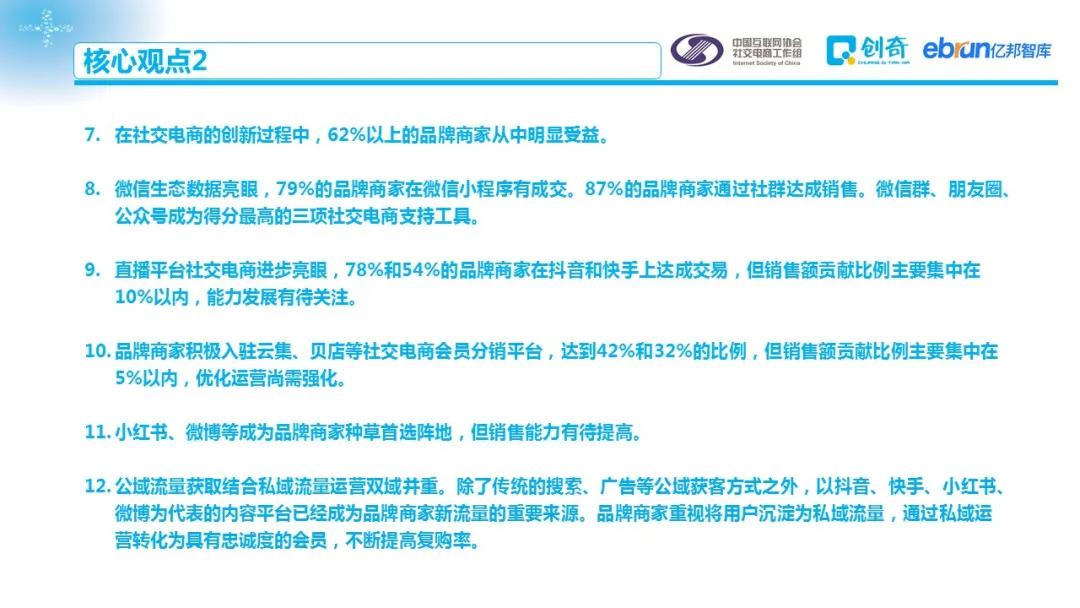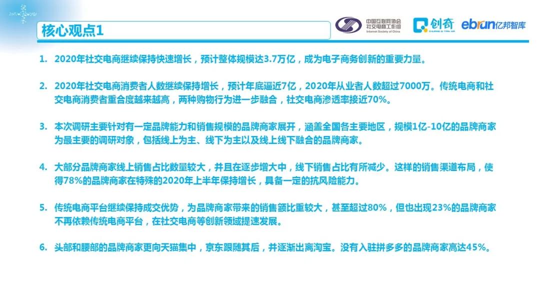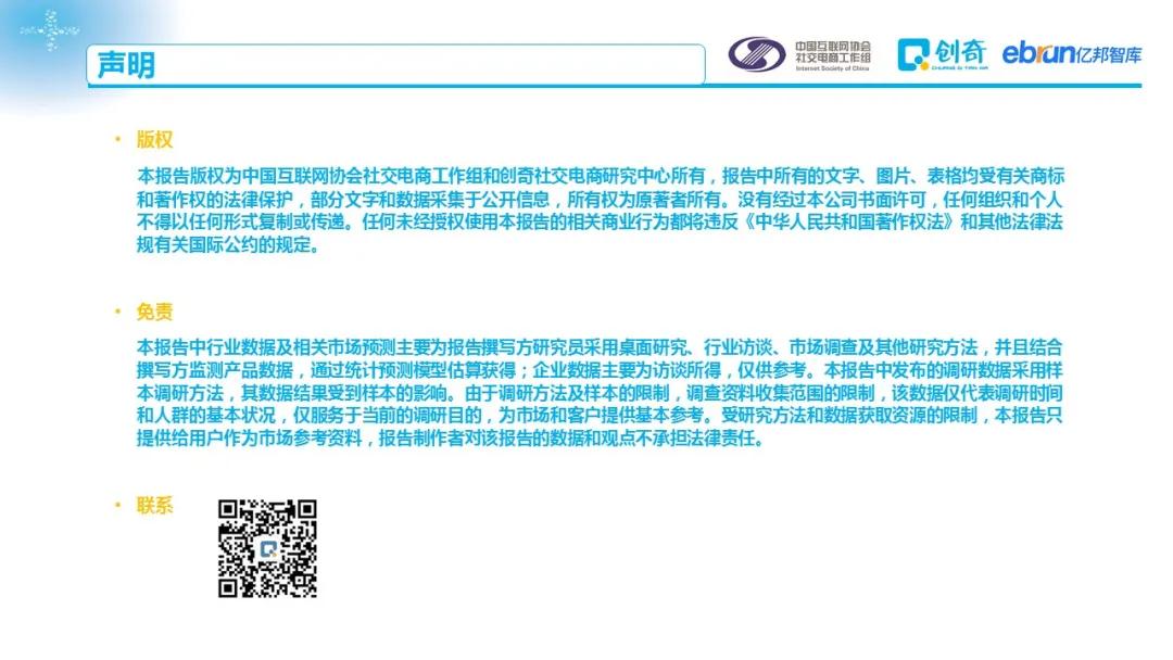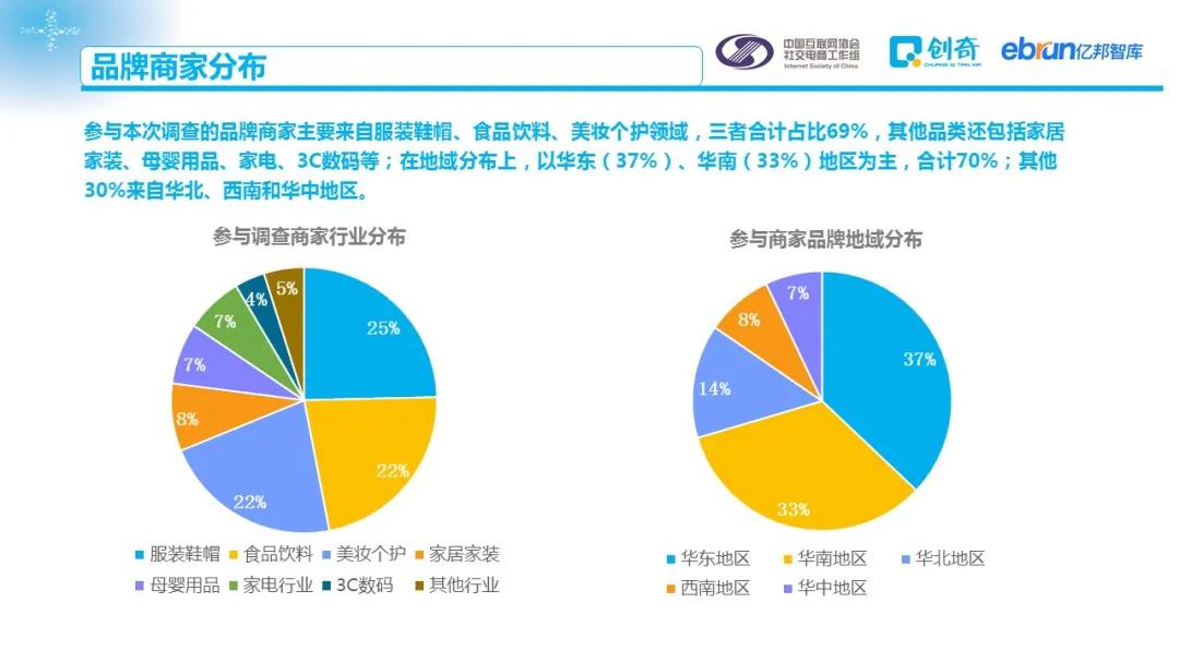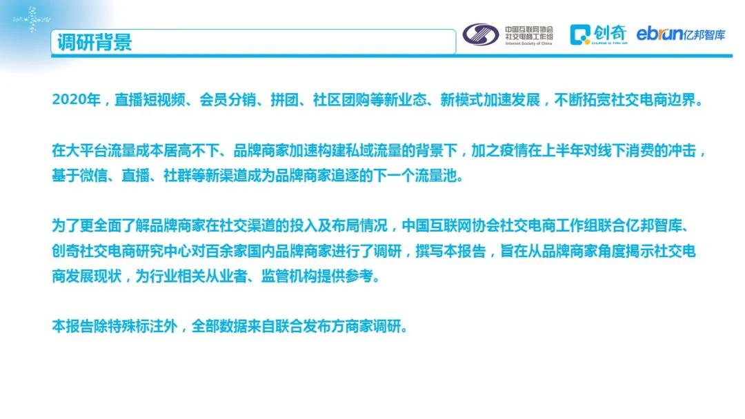 为了更全面了解品牌商家在社交渠道的投入及布局情况,中国互联网协会社交电商工作组联合亿邦智库、创奇社交电商研究中心对百余家国内品牌商家进行了调研,撰写本报告,旨在从品牌商家角度揭示社交电商发展现状,为行业相关从业者、监管机构提供参考。本报告除特殊标注外,全部数据来自联合发布方商家调研。