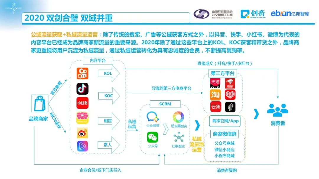 2020年直播短视频、会员分销、拼团、社区团购等新业态、新模式加速发展,不断拓宽社交电商边界。在大平台流量成本居高不下、品牌商家加速构建私域流量的背景下,加之疫情在上半年对线下消费的冲击,基于微信、直播、社群等新渠道成为品牌商家追逐的下一个流量池。