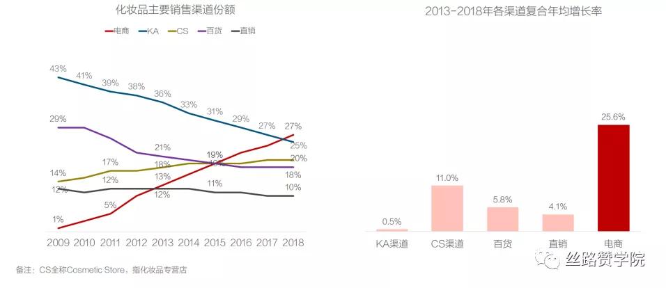 同时互联网的兴起和人们购物方式的转变推动也为线上化妆品市场日益壮大提供助力。各大电子商务企业兴起,用户的购物方式也随着网络购物的兴起而变得多样化和便捷,而这化妆品市场规模高速增长的背后我们可以看到,其中电商渠道的迅速崛起,在2018年成为了化妆品的第一大的销售渠道。