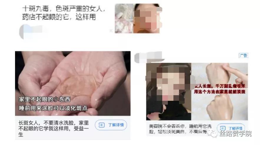 目前特殊用途化妆品在外层创意这块文案切入以用户痛点/仿科普类为主,通过引起用户的好奇心,再配合美女或使用场景相关的图片来吸引点击。以下参考素材均有较为优秀的表现,点击率达2.5%~3.5%。