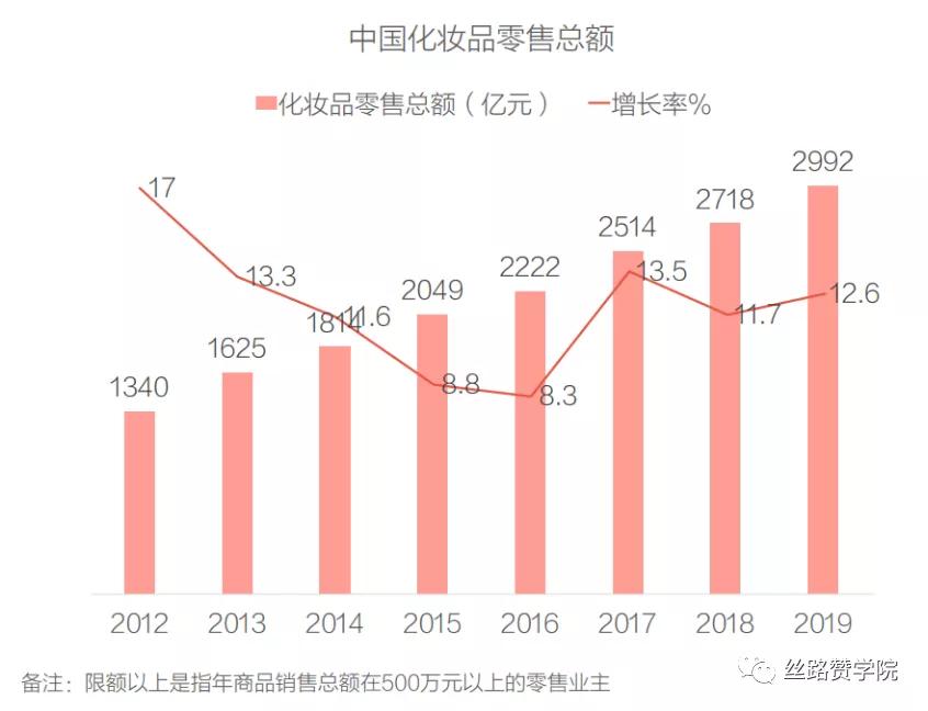 随着居民生活水平的不断发展与提高,居民手中可支配的收入越来越多,越来越多的女性注重自身的保养与打扮,近年来化妆品同比增速在限额以上的可选消费品类中的数据表现十分亮眼。2019年中国化妆品行业市场零售额(限额以上)达到2992亿元,在2012年至2019年期间,中国化妆品的市场规模也呈现高速増长的态势,年复合增长率达到8%。
