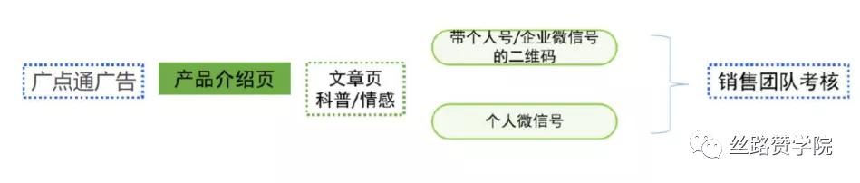 1)通过外层吸引点击,跳转到蹊径落地页搭建的产品介绍页,页面中加入跳转按钮,点击跳转到广告主自建外链,外链之中加入微信号或者微信二维码,添加完成,由后端销售团队进行跟进。(注意:这个链路需要广告主具备数据回传技术,回传复制微信号或者二维码的动作)以下为链路的示意图:
