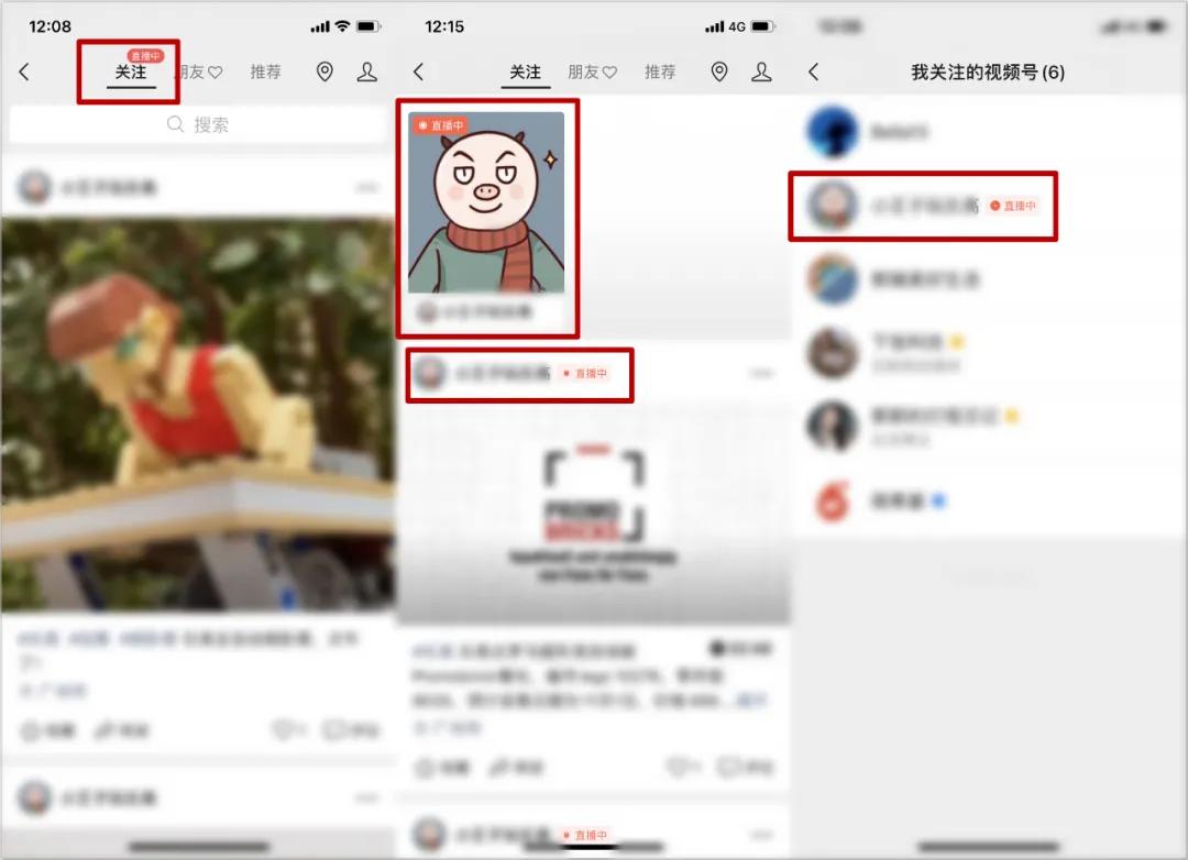 ? 在关注页面和我关注的视频号页面中,会有“直播中”提示