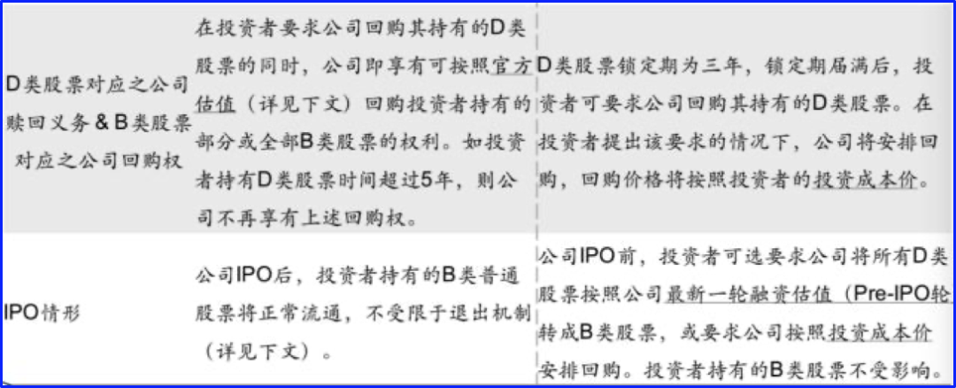 关于D类股(即无利债),在三年锁定期满后,投资者可要求大疆进行回购,价格按投资成本价计。