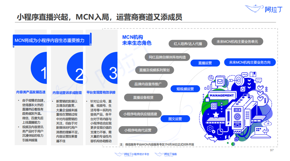疫情期间,微信、百度先后上线直播能力。从内容角度来看,视频及内容资讯类产品对于用户沉浸体验的吸力引越来越强。MCN将成为小程序内容生态重要推力。大量企业越来越重视在营销过程中对内容营销的关注,但由于对新媒体时代用户消费的理解不足,内容运营效果普遍不佳。再者,从平台变现的角度来看,针对公众号、直播、视频号、生活号等一系列内容类产品,各平台对于将内容与小程序结合实现更多变现价值的支撑力不够,需大量的专业性内容机构协助推动。