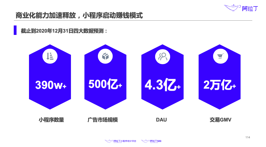 据阿拉丁白皮书预测,今年年底小程序日活将会达到4.3亿,广告市场规模达到500亿,交易GMV2万亿,小程序数量达到390万亿。