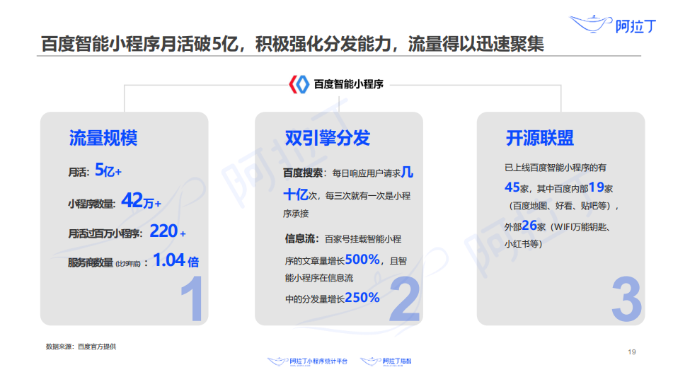 2020年上半年,百度智能小程序月活5亿+,小程序数量42万个,其中月活百万小程序有220个。百家号挂载智能小程序的文章增长了500%,并且智能小程序的分发量增长了250%。此外,百度小程序中上线的开源联盟合作伙伴有45家,其中百度内部19家(百度地图、好看、贴吧等),外部26家。