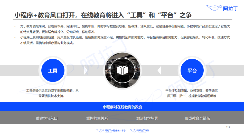在教育领域,白皮书研判道,小程序获客链条长,转化率低,授课方式不够灵活,需借助小程序重构业务模式。