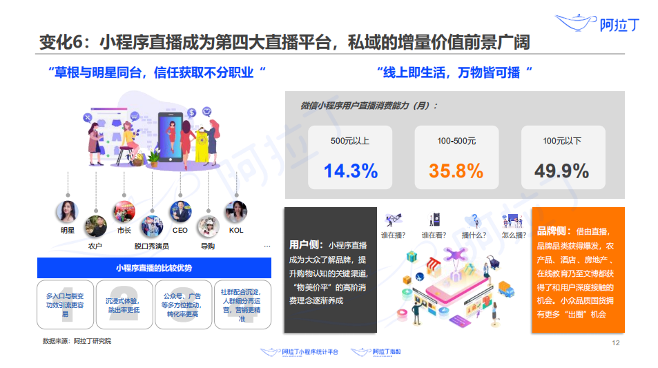 从用户和品牌的两个角度来看,用户侧:小程序直播成为大众了解品牌、提升购物认知的关键渠道,“物美价平”的高阶消费理念逐渐养成;品牌侧:借由直播,品牌品类获得爆发,农产品、酒店、房地产、在线教育乃至文博都获得了和用户深度接触的机会。小众品质国货拥有更多“出圈”机会。