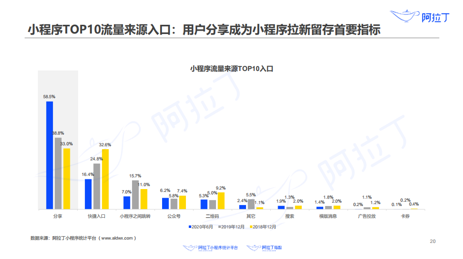 据悉,2020年6月通过用户分享小程序获得流量的方式占比高达58.5%,同比去年年底增长了20%,比2018年底增长了55%,分享成为小程序流量中心来源的核心入口;2020年6月通过快捷入口获得流量的方式占比16.4%,相比去年年底降低了8%;2020年6月通过小程序之间跳转获得流量的方式占比仅为7%,相比去年年底降低了8%。