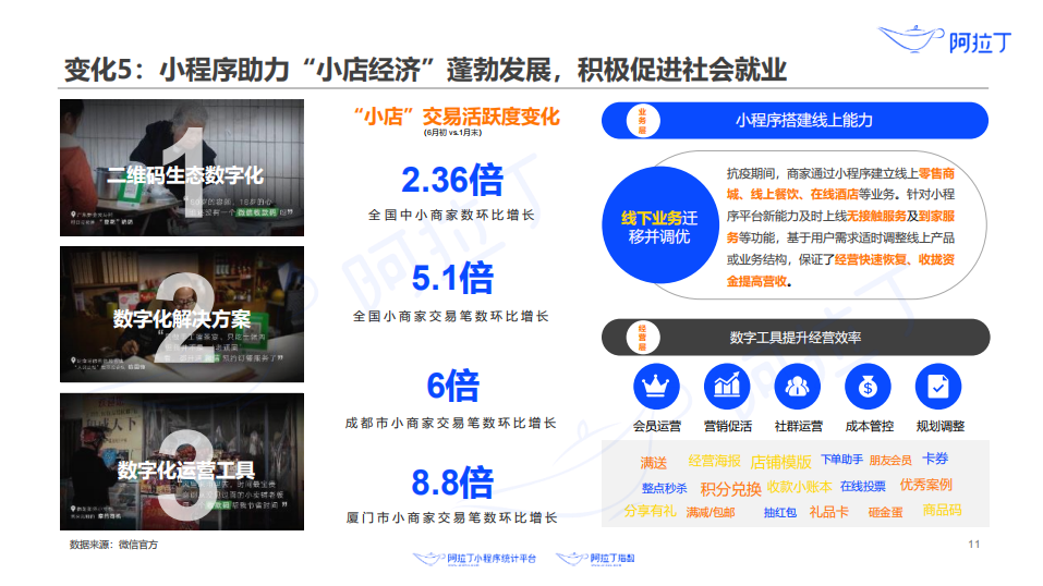 商家通过小程序建立线上零售商城、线上餐饮、在线酒店等业务。针对小程序平台新能力及时上线无接触服务及到家服务等功能,基于用户需求适时调整线上产品或业务结构。