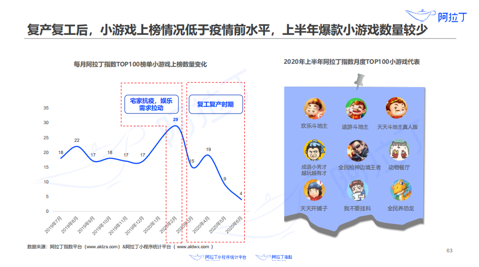 而后疫情时代下,小游戏类“宅经济”数据出现回落,用户在角色类游戏花的时间逐步增长。复产复工后,小游戏上榜情况低于疫情前水平,上半年爆款小游戏数量较少。