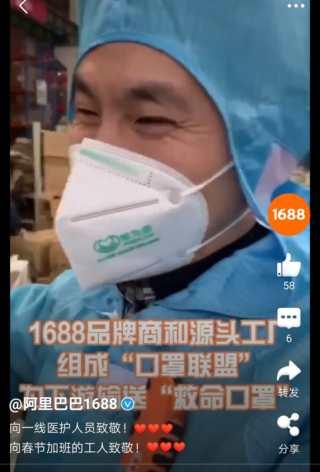 【亿邦动力讯】1月23日消息,“@阿里巴巴1688”今日发布微博称,1688品牌商和源头工厂组建了“口罩联盟”为下游输送“救命口罩”,工厂紧急召回工人放弃休假,保障供应;品牌商调度全球货源,连夜发货;还有商家直接将库存全部捐献给医院。