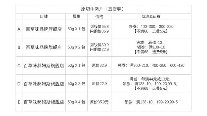 当你把百草味50g原切牛肉片(五香味),在两店中所有的商品都列出来,会发现更有趣的事情。
